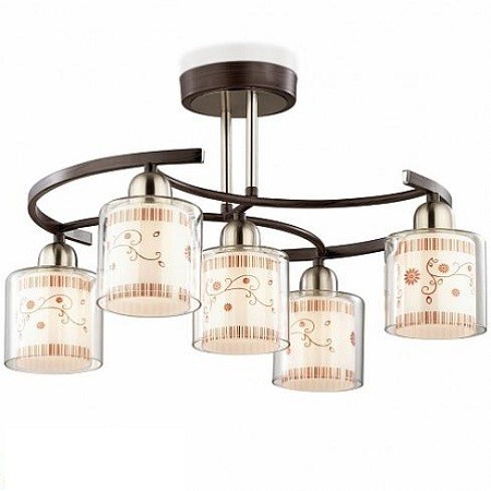 Люстра 2616/5C серии Marti имеет нехитрый, но приятный дизайн, по стилю близкий к кантри. Пять двухслойных цилиндрических плафонов подвешены к горизонтальной раме в виде неполного кольца. Внутренние стаканы плафонов украшены веселыми красновато-коричневыми узорами, а внешние полностью прозрачны и похожи на толстый слой защитного лака на расписной поверхности.
