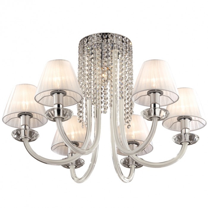 Люстра 2565/7C серии Meleza отличается сравнительно небольшой высотой благодаря отсутствию длинного «веретена» служащего основой светильников традиционной конструкции. Рожки люстры спускаются от диска, закрепленного прямо на потолке и, сделав плавную дугу, разворачиваются вверх для того, чтобы разместить по кругу конические абажуры с лампами внутри.