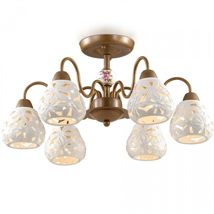 Белые стеклянные плафоны люстры, изготовленные из керамических кружев, выглядят необычно, празднично и очень красиво. Особенно красиво их сочетание с металлической арматурой, окрашенной под стилизованное старинное золото, покрытое густой патиной.