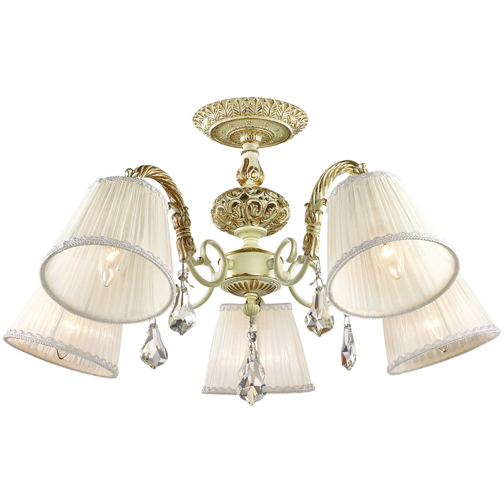Потолочная люстра изготовлена из металла с кремовым покрытием и золотой патиной. Классичесский дизайн данной модели прекрасно подойдет к любому интерьеру и станет его незаменимым дополнением, плафоны выполнены из ткани, декорирована люстра хрустальными подвесками. Помимо изысканного внешнего оформления, люстра обладает отличной производительностью. При максимальной мощности в 200 Вт она способна создать оптимальное освещение пространства площадью в 10 кв.м. Количество и цоколь используемых лампочек – 5хE14.