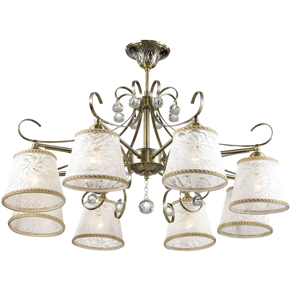 Потолочная люстра отличается особенным способом крепления к поверхности потолка, благодаря которому максимально экономится пространство. Одним из достойных примеров таких осветительных приборов является потолочная люстра 2918/8С. Данная модель относится к линейке светильников под названием Tavera, оформленной в популярном сегодня стиле модерн. Люстра выполнена в бронзовом цвете. Светлый тканевый абажур потолочной люстры украшен ажурным рисунком, декоративные элементы выполнены в виде хрустальных подвесок. Помимо изысканного внешнего оформления, люстра обладает отличной производительностью. При максимальной мощности в 320 Вт она способна создать оптимальное освещение пространства площадью в 16 кв.м.