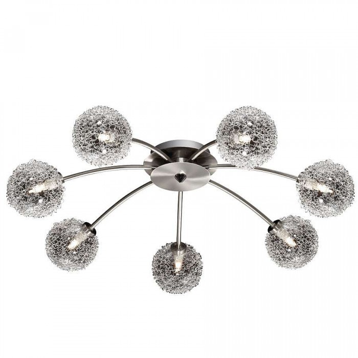 Потолочный светильник Odeon 2460/7С необычен и потому весьма интересен. Семь тонких металлических прутьев ровным веером выходят из центра светильника, образуя правильный круг по периметру. На торцах каждого из них водружен источник света, закрытый несколько непривычным плафоном, состоящим из сложного плетения тонкой проволоки. По своей форме плафоны схожи с одуванчиком, уже готовым отправить в дальние путешествия свои воздушные семена-парашюты. Это подтверждает и название коллекции – Roxby.