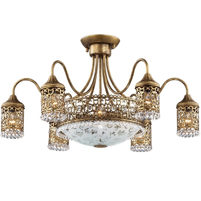 Представитель этой коллекции – люстра Odeon 2641/9С – состоит из центрального элемента светильника, закрытого снизу стеклянным плафоном, и собственно корпуса, представляющего собой изящное ажурное плетение бронзовых деталей. Такое оформление кружевной бронзой имеют еще шесть небольших плафонов, равномерно размещенных вокруг центрального элемента люстры. Эффектное дополнение центрального и дополнительных плафонов – густо расположенные подвесы, обрамляющие нижнюю часть каждого плафона.