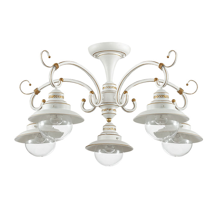 Люстра потолочная 3248/5C серии Sandrina оформлена в морском стиле.Люстра состоит из стеклянных прозрачных плафонов в форме сферы и оригинальной арматуры белого с золотой патиной цвета, украшенной ажурными металлическими элементами. Данная модель великолепно бы смотрелась на палубе пиратской шхуны, но в наше время прекарсно украсит любой современный интерьер.