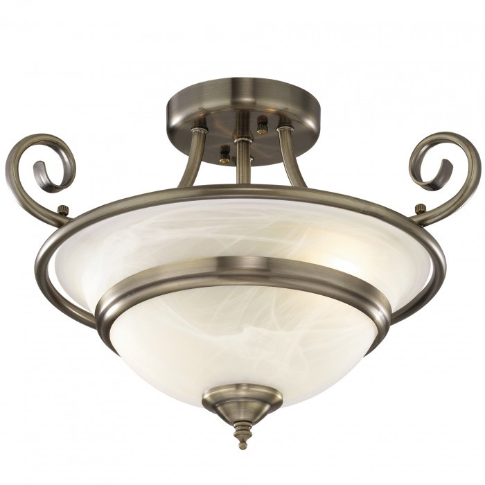 По форме плафон напоминает две полусферические чаши, наслоившиеся друг на дружку. Каждая из них имеет свой металлический обод, окрашенный, как и все металлические элементы светильника, под светлую бронзу.