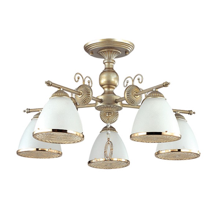 Потолочная люстра Gaspardo 3455/5C - это сочетание оригинальных декоров в духе испанских конкистадоров и изящного благородства линий. Оригинальный матовые плафоны декорированы металлическими декорами. Основание в центре декорировано подвеской со стразами в золотом обрамлении. При этом необходимо использовать лампочки с цоколем 5xE14.