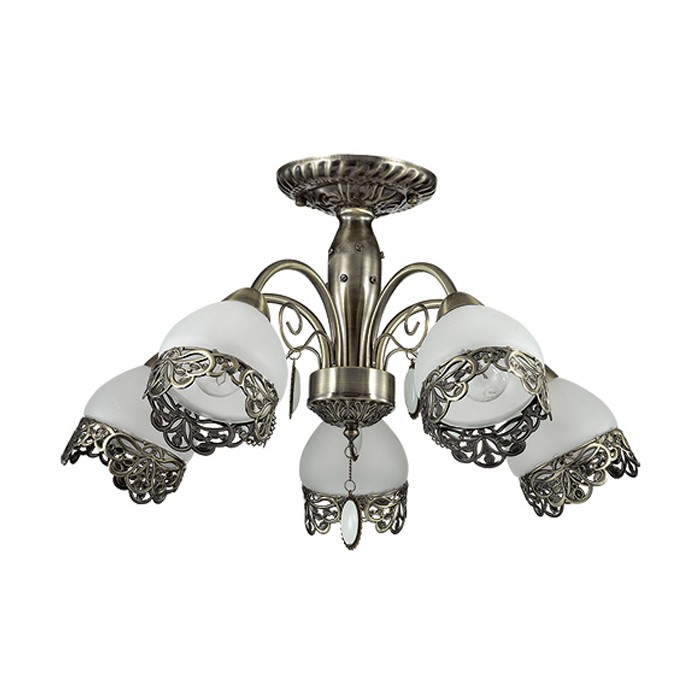 Потолочная люстра Makerra 3461/5C с Утонченной ажурной металлической окантовкой на белом матовом плафоне в сочетании с основанием в цвете бронза создает очень нежный и грациозный образ люстры. Особенно интересным является использование оригинальной подвески, напоминающей камень опал в металлическом обрамлении. При этом необходимо использовать лампочки с цоколем 5xE14.