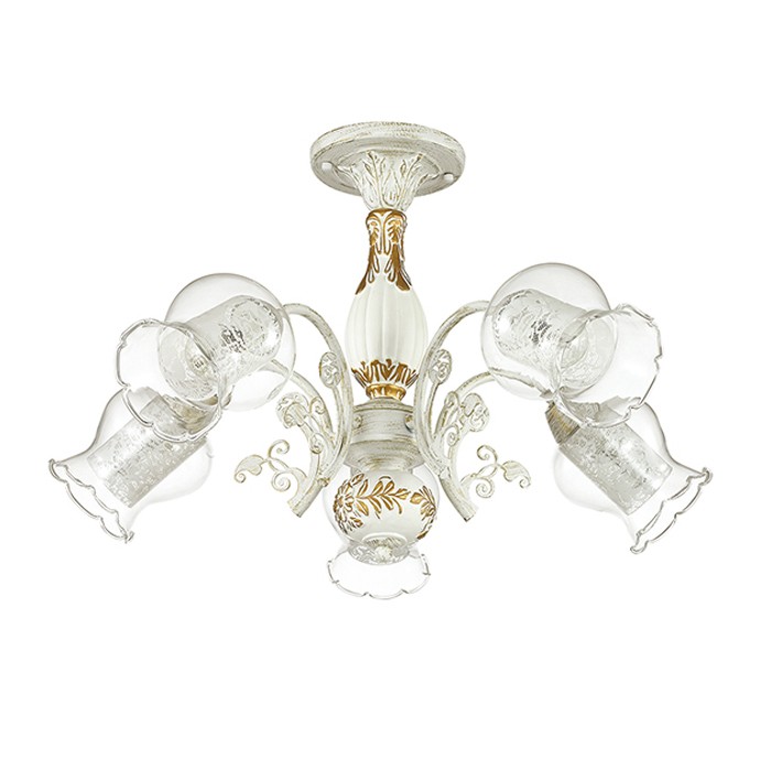Потолочная люстра Olivi 3430/5C является необычайно элегантной благодаря используемым двойным плафонам: внутреннему цилиндрическому с утонченным классическим орнаментом и прозрачному внешнему. На основании белого цвета с патиной нанесен золотистый растительный орнамент. При этом необходимо использовать лампочки с цоколем 5xE14.