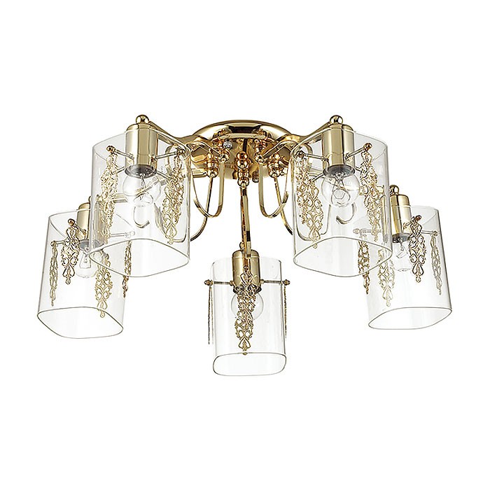 Потолочная люстра 3069/5C серии Ora оформлена в стиле арт-деко. Люстра состоит из прозрачных стеклянных плафонов прямоугольной формы, украшенных ажурным металлическим рисунком и арматуры золотого цвета. За счет сочетания цвета каркаса с рисунком на плафоне модель выглядит очень современно и стильно, сохраняя при этом классический дизайн. Необходимо использовать лампы с цоколем E27.