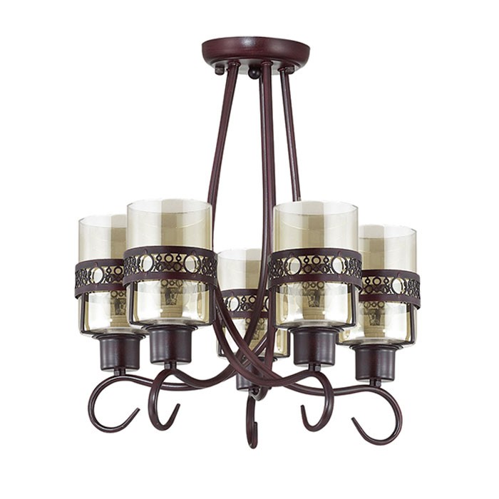 Потолочная люстра 3098/5C серии Vitelia оформлена в стиле прованс. Люстра состоит из прозрачных стеклянных плафонов с ажурным металлическим ободком и оригинальной арматуры приятного кофейного цвета. В данной модели соединились необычные переплетения каркаса в сочетании с классикой плафонов. Необходимо использовать лампочки с цоколем E27. Мощность 5x40W позволяет освещать территорию площадью до 10 кв. м ровным, приятным светом.