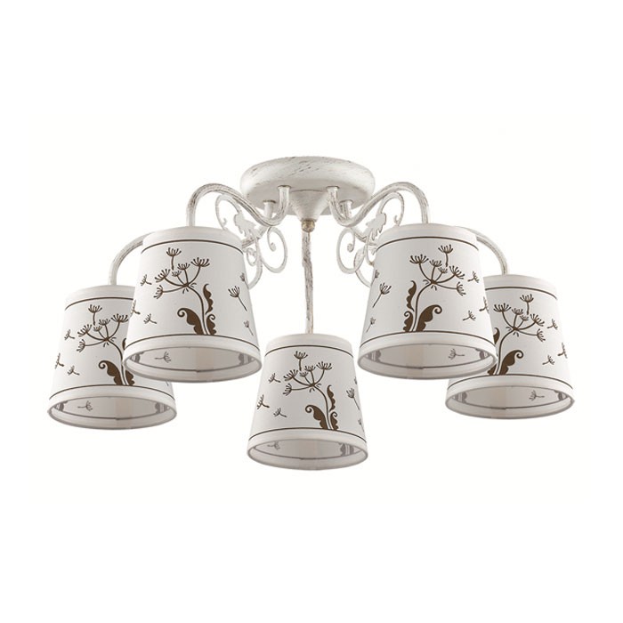 Потолочная люстра 3205/5C серии Zinetta оформлена в стиле прованс. Люстра состоит из тканевых абажуров с веселым принтом и белой, украшенной золотой патиной, арматуры с ажурными декоративными элементами. С данной моделью в доме всегда будет хорошее настроение. Необходимо использовать лампочки с цоколем E14. Мощность 5x40W позволяет освещать территорию площадью до 10 кв. м ровным, приятным светом.