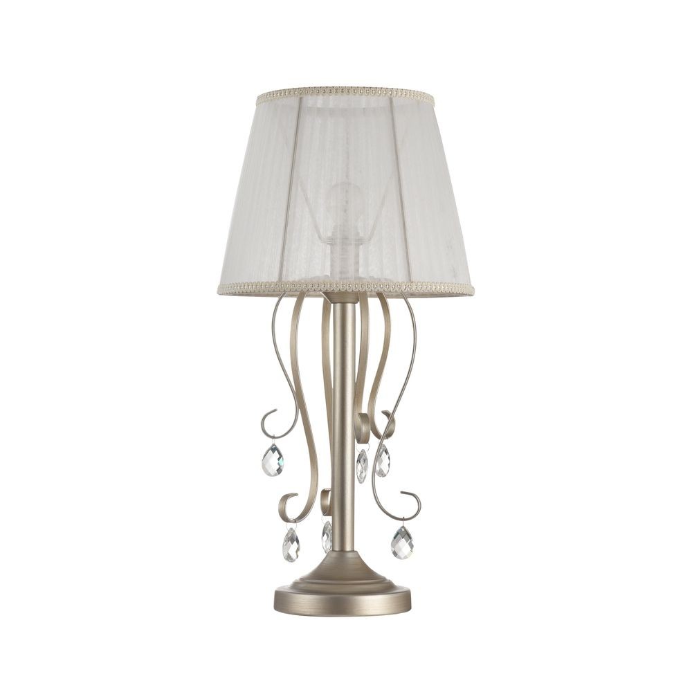 Настольная лампа Simone FR020-11-G оформлена в стиле арт-деко и легко сочетается с другими элементами обстановки. Симпатичный тканевый плафон белого цвета прекрасно смотрится с латунного цвета металлической арматурой. Абажур выполнен из органзы, конструкция декорирована подвесками из хрусталя. Светильник способен создавать освещенную зону площадью в 2 кв. м, поскольку обладает мощностью в 40 Вт. Цоколь лампочек – 1xE14.