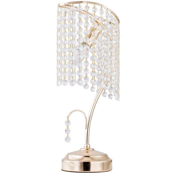 Настольная лампа DIA125-00-G относится к серии Picolla, коллекции Diamant crystal, дизайн которой исполнен в стиле арт-деко. Переплётный каркас из металла, окрашенного в два цвета: хром и золото. Декоративные подвески «звездной» огранки из хрусталя высшего класса.