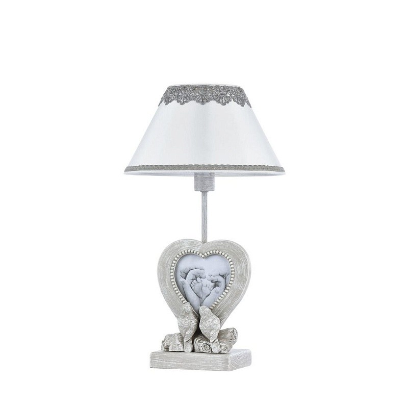 Настольная лампа интерьернаяARM023-11-S относится к серии Bouquet, коллекции Elegant, дизайн которой исполнен в стиле прованс. Арматура из металла окрашена в необычный цвет «серый антик». Абажур из материала ПВХ, покрытый тканью, украшен натуральным кружевом. Украшают основание фигурки птиц и рамка для фото в форме сердца.