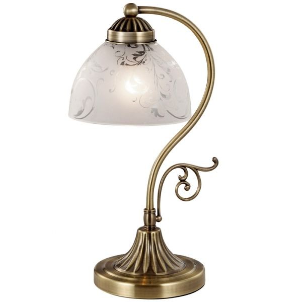 Настольная лампа Odeon 2542/1Т имеет классическую форму и характерное этому стилю богатое оформление. Ее круглая металлическая подставка украшена рельефными узорами, плавно переходящими в орнамент стойки. Сама стойка демонстрирует изысканные плавные линии гладкой металлической арматуры. Все металлические детали светильника окрашены под латунь. Весьма эффектно с этой композицией сочетается небольшой стеклянный плафон, оформленный абстрактными прозрачными узорами.