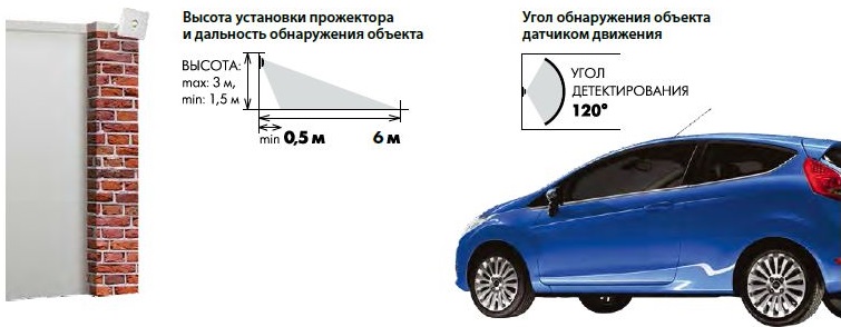 Данный прожектор оборудован датчиком движения. Датчик подает электропитание на светильник при обнаружении движения в зоне своего обзора. Устанавливать данный прожектор можно на высоту от 1,5 до 3 м. Угол детектирования устройства составляет 120о, дальность обнаружения – до 6 м. Время срабатывания – 3 секунды, время задержки отключения – 5 минут.