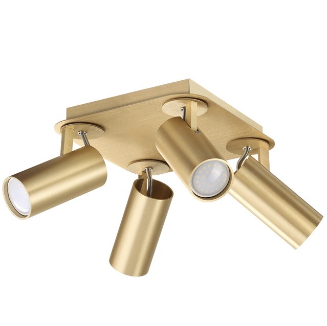 Поворотный спот Odeon Light Corse 3876/4C с четырьмя источниками света в матовом золотистом цвете со стильным металлическим креплением из нержавеющей стали со сменными лампами с цоколем GU10 - функциональный и надежный светильник, который прослужит вам долго. Предназначен для монтажа на потолок. Рекомендуется использовать как дополнительный осветительный прибор. Материалом для производства плафонов служит металл. Форма плафона цилиндр. В виде источника света используются лампы галогеновые мощностью 50 ватт.