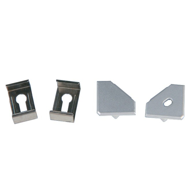 Набор включает 4 крепежные скобы и 4 заглушки. Заглушки выполнены из качественного пластика, монтажные скобы — из стали. Крепление рассеивателей и заглушек осуществляется с помощью замка-защёлки. В рамках одной серии приобретаются заглушки и крепёж, прозрачные или матовые рассеиватели. Все эти элементы позволяют придать конструкции законченный вид.