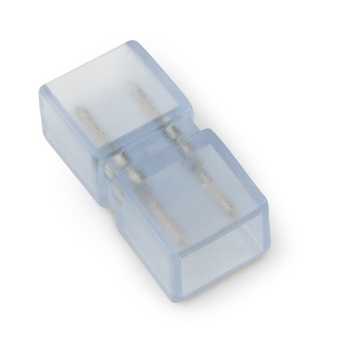 Соединитель представляет собой миниатюрное устройство с сечением 10x7 мм, оснащенное двумя контактами. Он предназначен для соединения двух отрезков светодиодной ленты 220 В. Данный коннектор имеет жесткое соединение и используется для визуально незаметного соединения двух отрезков ленты на прямых участках. Надёжность соединения обеспечена качественными прочными контактами с высокой электрической проводимостью. При монтаже необходимо соблюдать полярность, то есть контактные площадки ленты должны совпасть с соответствующими контактами соединителя.