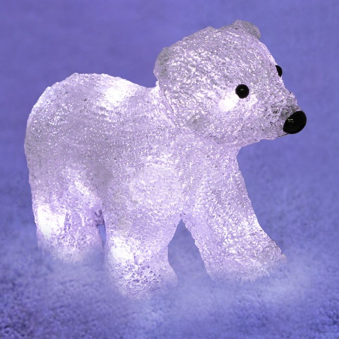 Акриловая светодиодная фигура "Медвежонок" высотой 18 см, светящаяся более чем 16 ярких диодов, на батарейках, выполненная по специальной технологии нанесения акрила имитируя шерстяной покров реального животного. Она позволит Вам создать ту самую, настоящую новогоднюю атмосферу и принести сотни радостных улыбок.