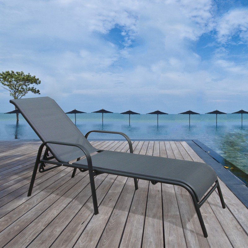 Его каркас, представленный основанием лежака, высокими подлокотниками, частично выполняющими роль ножек и четырьмя дополнительными ножками выполнен из алюминиевой трубы D42x14/30x19, покрытой полимерным покрытием. К каркасу крепится комфортный лежак из материала текстилен 2х1.