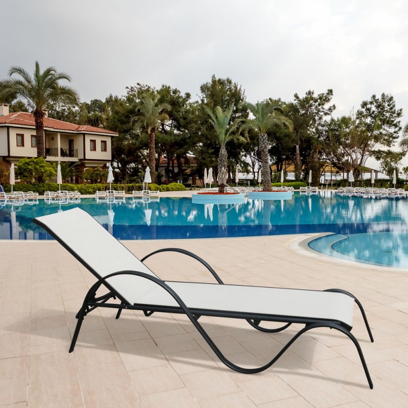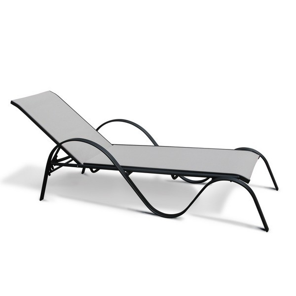 Его каркас, представленный основанием лежака, волнообразными подлокотниками, четырьмя ножками выполнен из алюминиевой трубы D42x14/30x19, покрытой полимерным покрытием. К каркасу крепится комфортный лежак из материала текстилен 2х1.