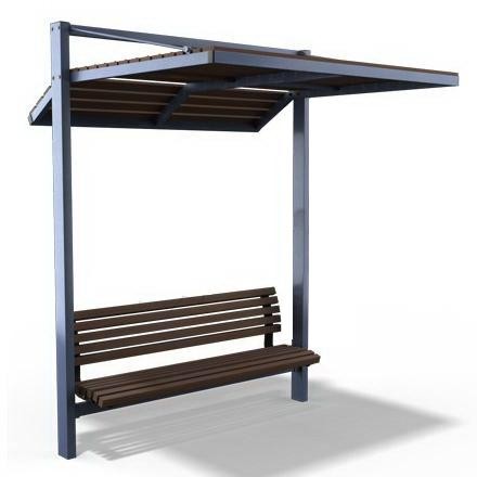 Навес со скамейкой "Модерн УНИ" изготовлен из профильной стальной трубы и деревянного бруса. Установка с помощью бетонирования.