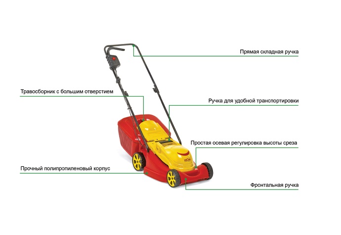 Колеса оборудованы шарикоподшипниками, которые увеличивают маневренность, и делает ход агрегата ровным и плавным. Благодаря небольшим габаритам, малому весу и складной ручке газонокосилку можно с легкостью транспортировать и удобно хранить.