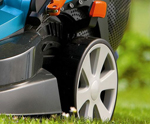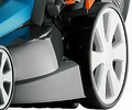 Электрический двигатель с ременной передачей на нож обеспечивают аккуратный результат кошения. Инновационная технология позволила существенно снизить общий вес, а большие колеса со специальным профильным рисунком повысили мобильность и маневренность газонокосилки. Движение по траве стало гораздо более плавным.