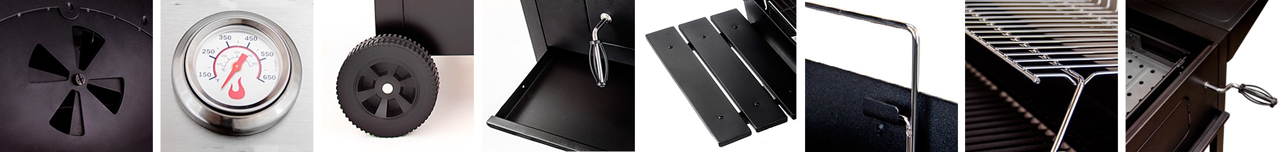 Гриль очень комфортен в эксплуатации. Он имеет удобные ненагревающиеся боковые пристолья и три крючка для инструментов. Съемный поддон для пепла позволяет легко почистить гриль. Решетка для угля регулируется с помощью специальной ручки. Колеса обеспечивают легкое перемещение изделия.