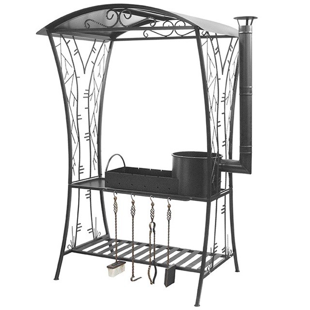 Особенностью мангала является мангальная вставка с печью под казан, а также наличие высокой вытяжной трубы самоварного типа. Благодаря этому дым, выходящий из трубы, не мешает окружающим. Конструкция также предполагает место для размещения тарелок и оснащена вместительной полкой для дров. А крыша обеспечит укрытие огня и готовящейся на нем пищи от осадков.