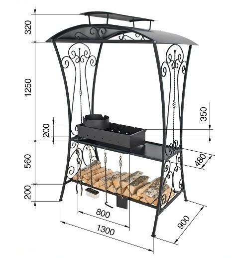 Особенностью мангала является съемная печь под казан, которая позволяет при необходимости увеличить количество шампуров уложенных на мангал. Конструкция также предполагает место для размещения тарелок и оснащена вместительной полкой для дров. А крыша обеспечит укрытие огня и готовящейся на нем пищи от осадков.