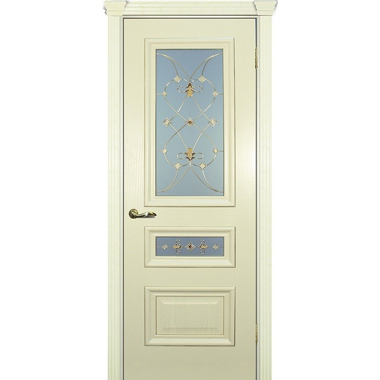 Дверное полотно Текона Фрейм 05 Ясень слоновая кость патина золото 2 стекла витраж Калипсо белое – это прекрасная межкомнатная дверь для ценителей качественного, классического интерьера. Особое украшение и изысканность полотну придает багетная рамка с тисненным багетом и возможность использовать не только обычное оформление проемов наличниками, но и декорировать их пилястрами и капителями. Такой дизайн делает двери Фрейм особо привлекательными для дизайнеров.
