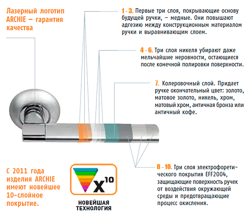 Особого внимания заслуживает тот факт, что поверхность ручек Archie обрабатывается по запатентованному методу нанесения электрофоретического покрытия. Эта технология предполагает поэтапное нанесение 10-и защитных слоёв с промежуточными просушками на различных температурных режимах. Хотя такой процесс является более сложным, по сравнению с традиционным способом покрытия ручек для дверей композиционным лаком, в результате его применения срок службы изделий увеличивается до 25 лет.