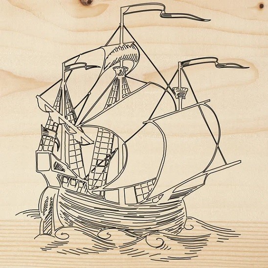 На доску нанесен рисунок «Каравелла». Для занятий понадобится прибор для выжигания.