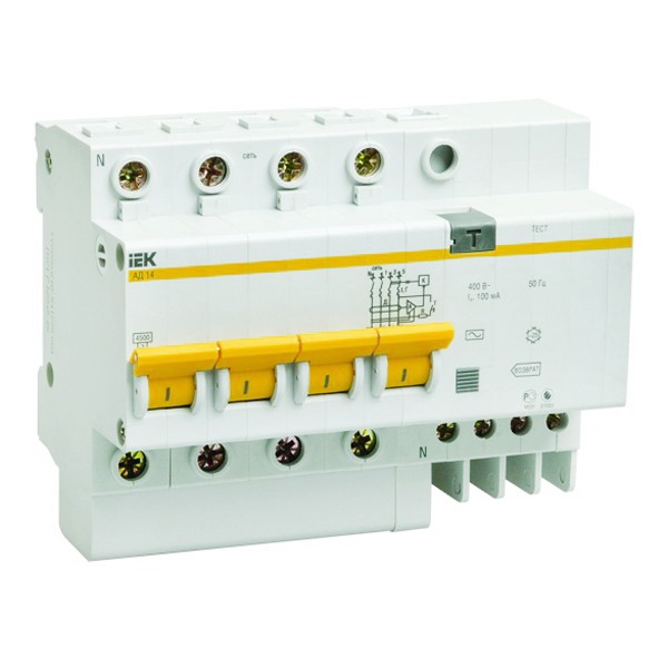 IEK АД14 4Р – быстродействующий защитный выключатель, реагирующий на дифференциальный ток, со встроенной защитой от сверхтоков. Обеспечивает три вида защиты – защиту человека от поражения электрическим током при случайном непреднамеренном прикосновении к токоведущим частям электроустановок при повреждениях изоляции; предотвращение пожаров вследствие протекания токов утечки на землю; защиту от перегрузки и короткого замыкания.
