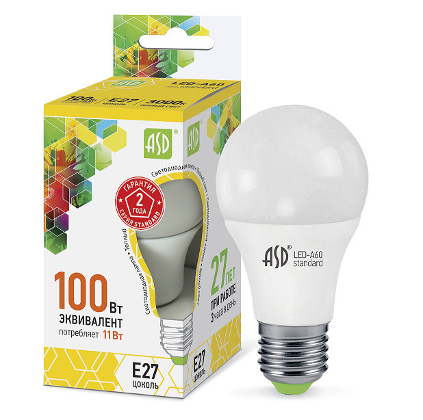 Лампа светодиодная ASD Standard A60 11W Е27 3000К выполнена в классической форме груши. Рекомендуются для замены обычных ламп накаливания в светильниках с патроном Е27 и позволяют использовать лучшие преимущества светодиодов: высокое значение энергоэффективности, направленность, высокое значение CRI и долговечность, малая степень нагрева и высокая травмобезопасность (полностью отсутствует стекло в конструкции ламп).