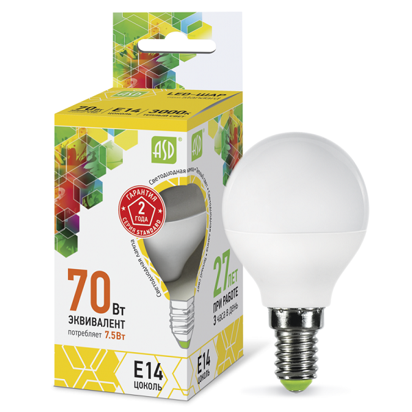Светодиодная лампа ASD Standard Шар 7,5W Е14 3000К обладает матовой колбой в форме шара. Это безопасный, эффективный и экологичный источник освещения. Лампа излучает мягкий комфортный свет, широко применяется в люстрах и светильниках с маленькими плафонами. Идеальный вариант для декоративного освещения в жилых помещениях – гостиных, обеденных зонах, спальнях и коридорах.